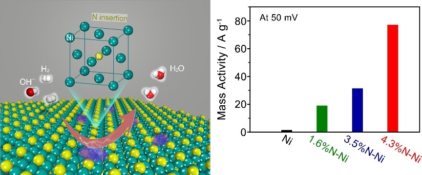 针对这一问题,王得丽教授团队提出了精确控制金属Ni的轨道杂化和应变场的策略,通过构建氮嵌入镍纳米片实现了高活性且低成本HOR催化剂的开发(图1)。氮原子的引入一方面可与近邻镍位点产生d-sp轨道杂化,优化镍位点对反应中间体H的吸附;另一方面也可使镍晶格发生拉伸应变,增强镍位点对反应中间体OH的吸附,从而可以显著加速碱性氢氧化反应过程。相应的,氮嵌入镍纳米催化剂的质量活性高达77.13 A g-1,是纯镍催化剂的53倍。该工作为燃料电池氢氧化反应催化剂的设计提供了新思路。