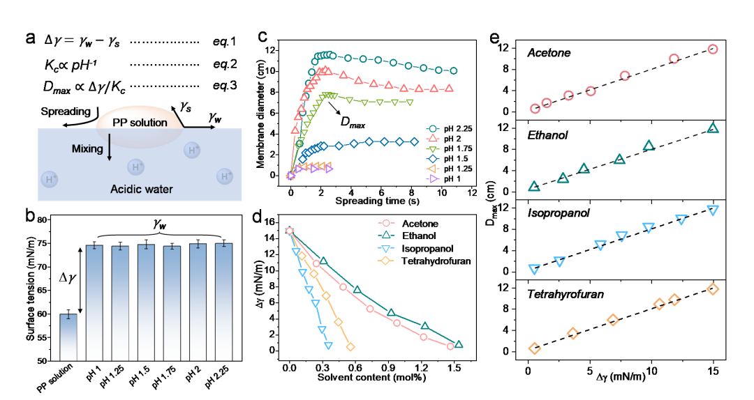 含有聚乙烯亚胺(PEI)和聚苯乙烯磺酸钠(PSSNa)的水溶液滴在水表面自发铺展成膜(图1,图2)。一般而言,水溶液液滴与水接触时首先发生向水中的扩散与混溶,而非铺展。为了抑制水-水扩散与混溶,作者设计了PEI-PSSNa和混合溶液,其pH为碱性。当该溶液液滴与酸性水接触时,水中含有的大量质子促使PEI高分子链上的氨基质子化,随后带正电的PEI与PSSNa在水-水界面上发生静电络合,有效抑制了溶液向水中的扩散与混溶。与此同时,PEI-PSSNa的表面张力比水低,液滴因此在水表面可自发铺展,而非混合。二者协同,促使了水溶液液滴在水面进行自发铺展。
