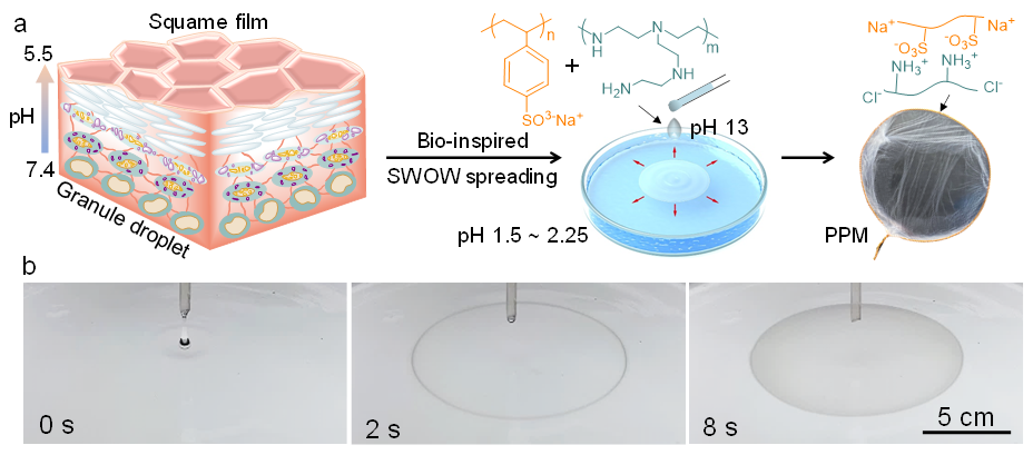 图1受皮肤分化过程启发的水-水铺展与聚电解质膜制备机制