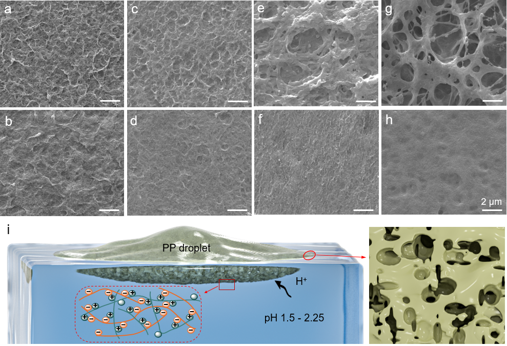 该工作研究了表面张力和pH对聚电解质的组装行为和多孔膜微结构、宏观尺寸的影响(图3)。本方法无需表面活性剂或降低液滴尺寸,简化了水-水自发铺展和多孔膜的制备过程,适用于多种聚电解质和纳米材料,扩大了相溶界面材料组装的应用范围。通过该方法制备的多孔聚电解质-碳材料复合膜在1个太阳的照射下表现出优异的水蒸发脱盐性能(2.8 kg/m2h)。该工作提出了聚电解质水溶液在水表面自发铺展和组装成膜的新机制,为聚合物在界面自组装的微观结构调控以及在膜分离、脱盐等领域应用提供了新思路。