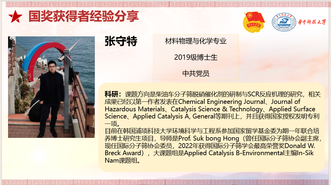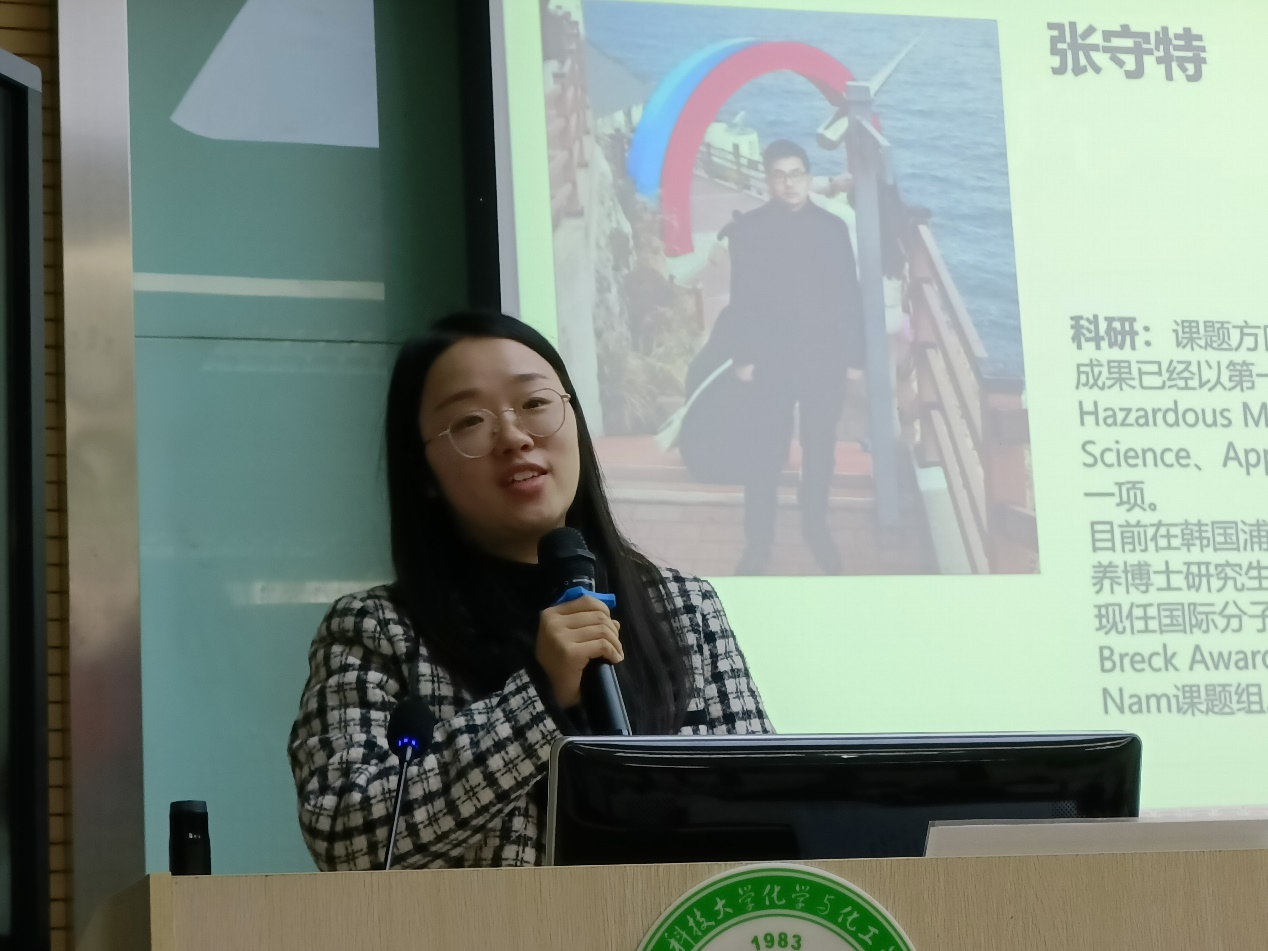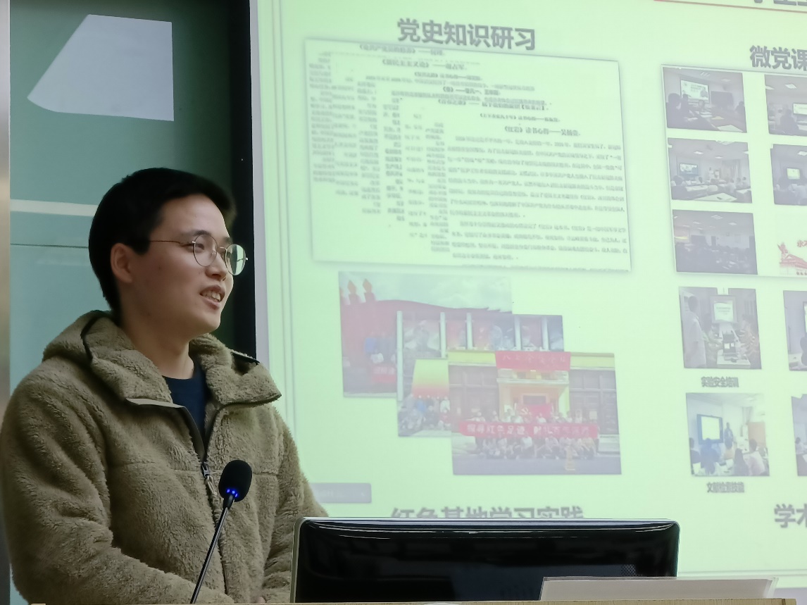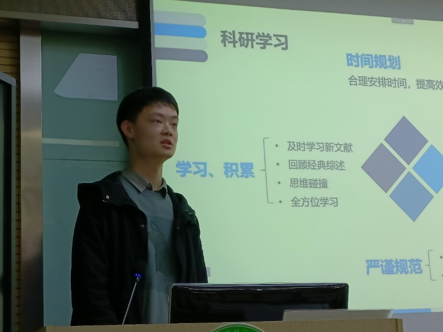 陈振贤以科研.生活6+1为题展开,首先从员工工作以及课外生活做了介绍。研究生生活不应该只有学术,同样可以玩出强大。在就职党支部书记时,组织参与了多种形式组织生活,微党课论讲,红色基地实践等活动;在暑期时,借助公司喻竹计划平台积极进行暑期实践等等,向我们展示了不一样的研究生生活。