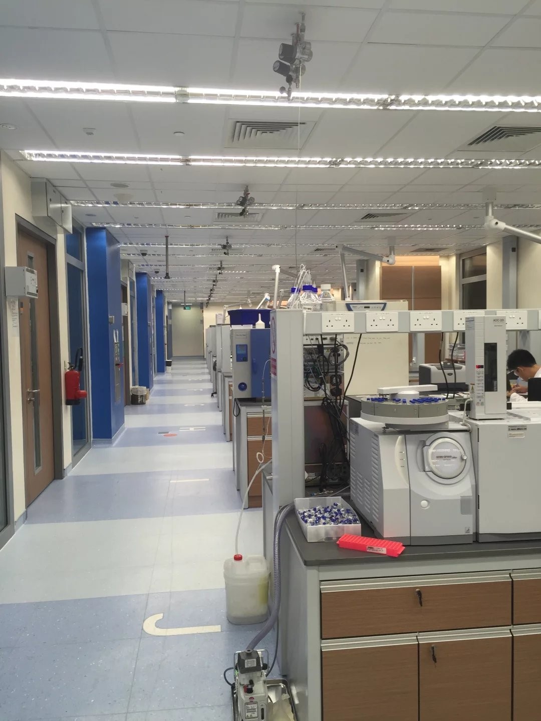 如图,可见地板对每个区域进行了分区,在走廊的左侧,是隔开的一间间的实验室,也就是导师们的实验室。科研实验室内又分为两个部分,其一是实验平台、其二是休息室,与实验室玻璃以隔,但是要求确非常严格。进入休息室,不能穿实验服,甚至不能带入自己的实验记录本,即严格禁止任何可能携带实验药品的物品。