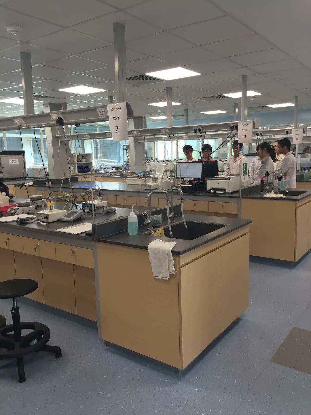 抵达化学系后,Elizabeth Lee教授带领大家参观了本科生教学实验室和各大仪器中心。我们了解到,由于设备空间和人员有限,各年级各小组每次的实验都不相同,因为他们要做到两位老师带领三四位同学的效果。这样,才能确保同学们的实验安全以及对实验技能的掌握程度。也因为国立大的员工少,每一次实验又将员工分流,所以员工实验做出的产品都可以使用仪器进行表征,比如有机产品,大家可以去做IR、UV等。另外,员工实验室桌面不允许放书本、记录本之类的学习用具,因为公司不希望同学们把化学药品不小心带入生活区。每个实验桌下都为员工们备好了放置书本的桌板和放置书包的柜子。