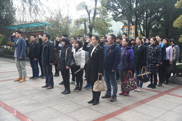 各党支部同志在工作人员和各自党支部书记的组织下有序进入烈士陵园,并于烈士纪念碑前庄严列队。首先,本次参观学习活动主持人丁琬芝严肃诵读了悼念词,全体党员同志在烈士纪念碑前默哀,表达对革命英烈、各界杰出前辈的深切悼念与由衷敬意。默哀完毕后,公司党委副书记吴疆鄂老师讲话,希望全公司党员师生认真参与本次参观学习活动,深刻体会身为党员的责任与使命,充分发挥党员作用。此后,研究生德育助理于汾、本科生辅导员孙健康带领全体师生党员在烈士纪念碑前庄严宣誓。
