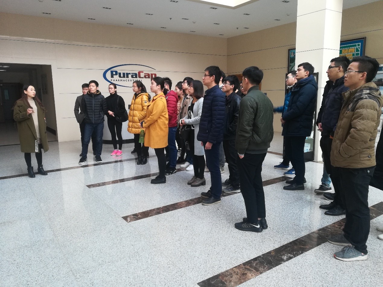 我们第二站来到了成立于2009年,人福医药集团最引以为傲的人福普克药业有限公司。公司HR非常欢迎我们的到来,她表现出对人福普克高度的自豪感,人福普克是我国首个出口美国的软胶囊药物生产企业,生产的OTC(非处方药)产品已销往美国WALMART等各大主流商超,生产量超过10亿,她还自豪的说道,目前人福普克的厂房已经不足以满足他们生产的需求,二期厂房正在修建,建成后产量可以超过20亿,同学们也表现出对人福普克生产的胶囊的浓厚的兴趣。