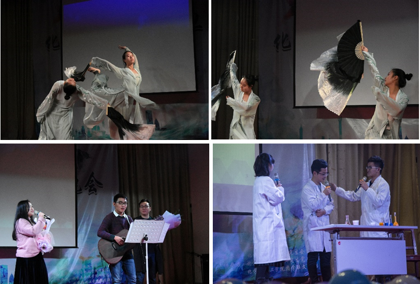 欣赏完了本科同学们的精彩表演,公司研究生们也不甘落后。主持人韩优嘉为大家带来了古筝独奏《梁祝》,熟悉的旋律使观众回想起曾经追过的电视剧,此外研究生党务中心的同学们为我们带来了自编自导了小品“科学实验室”,将化学融入小品中,展现了化学的独特魅力。