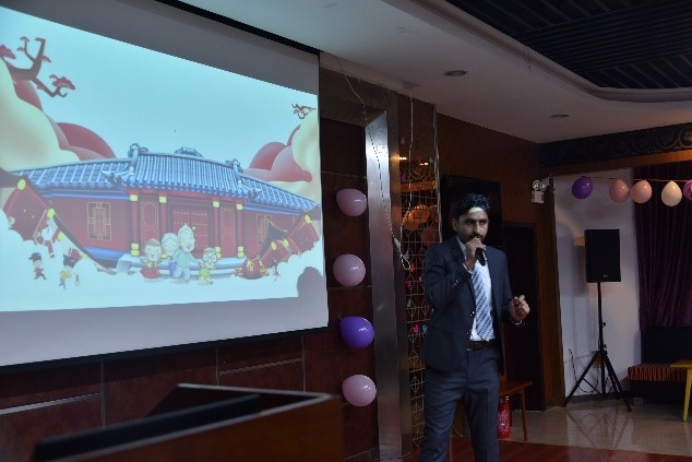 晚会逐渐接近尾声,罗邦德老师向职工介绍中国新年的由来和习俗。他知识广博,妙言成趣,晚会现场频频传出欢乐的笑声。