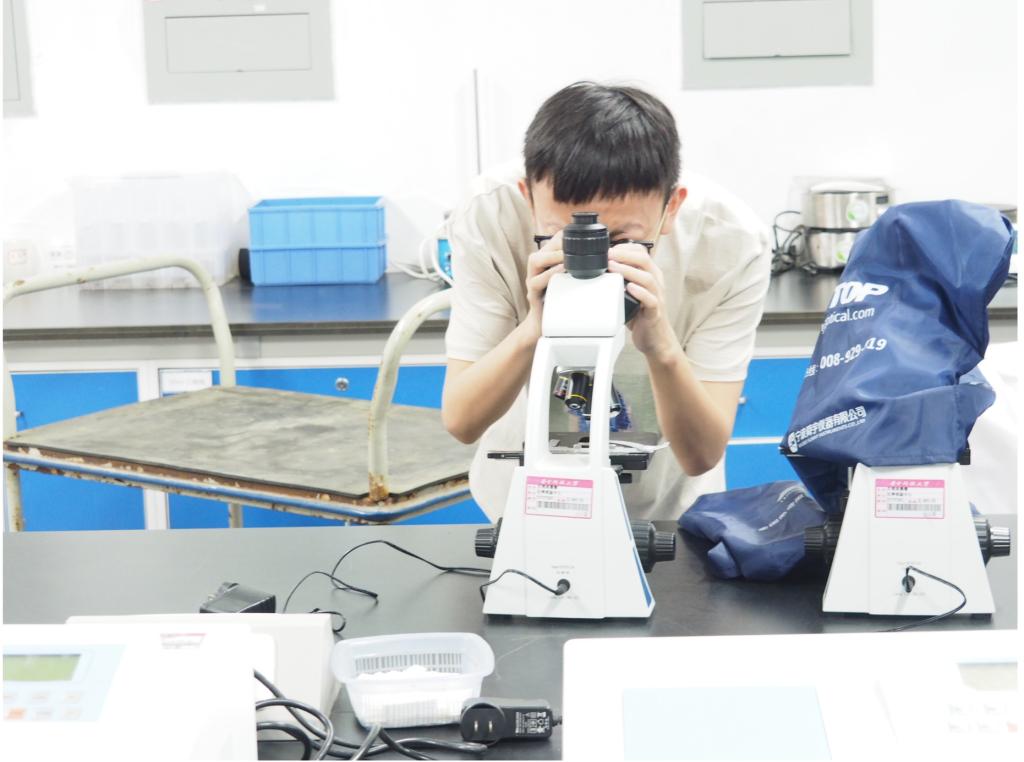 员工班主任宋逸菲(上)、张昀(下)示范实验操作