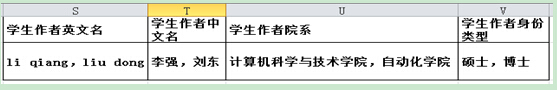 请将所有属于员工的作者信息全部填入员工作者信息栏(S-V列),有几个员工作者,就需要填入几个员工作者的信息,之间用“逗号(,)”隔开。如某篇论文中有“李强、刘东”为公司员工,分别是计算机公司与自动化公司,李强是硕士,刘东是博士,则填写如下: