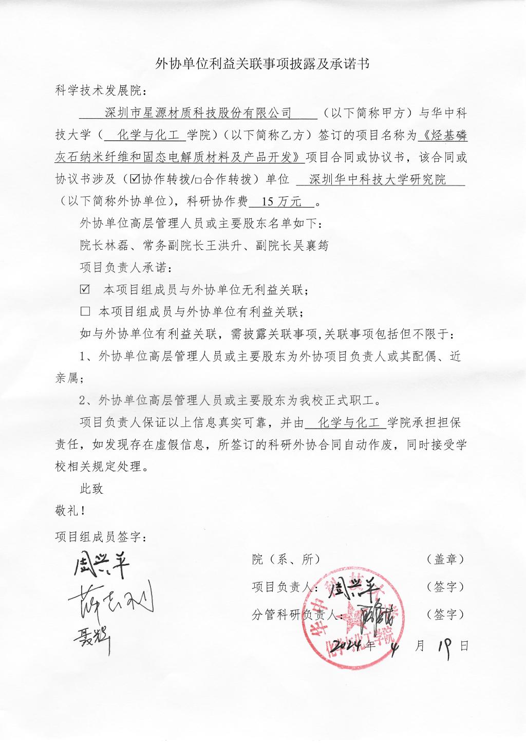 根据校科发院有关规定和要求,对公司《烃基磷灰石纳米纤维和固态电解质材料及产品开发》项目的外协单位利益关联事项披露及承诺书进行公示。