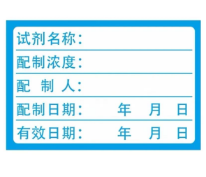 1. 所有化学品和配制试剂都应贴有明显标签,杜绝标签丢失、新旧标签共存、标签信息不全或不清等混乱现象。配制的试剂、反应产物等应有名称、浓度或纯度、责任人、日期等信息(如下图)。