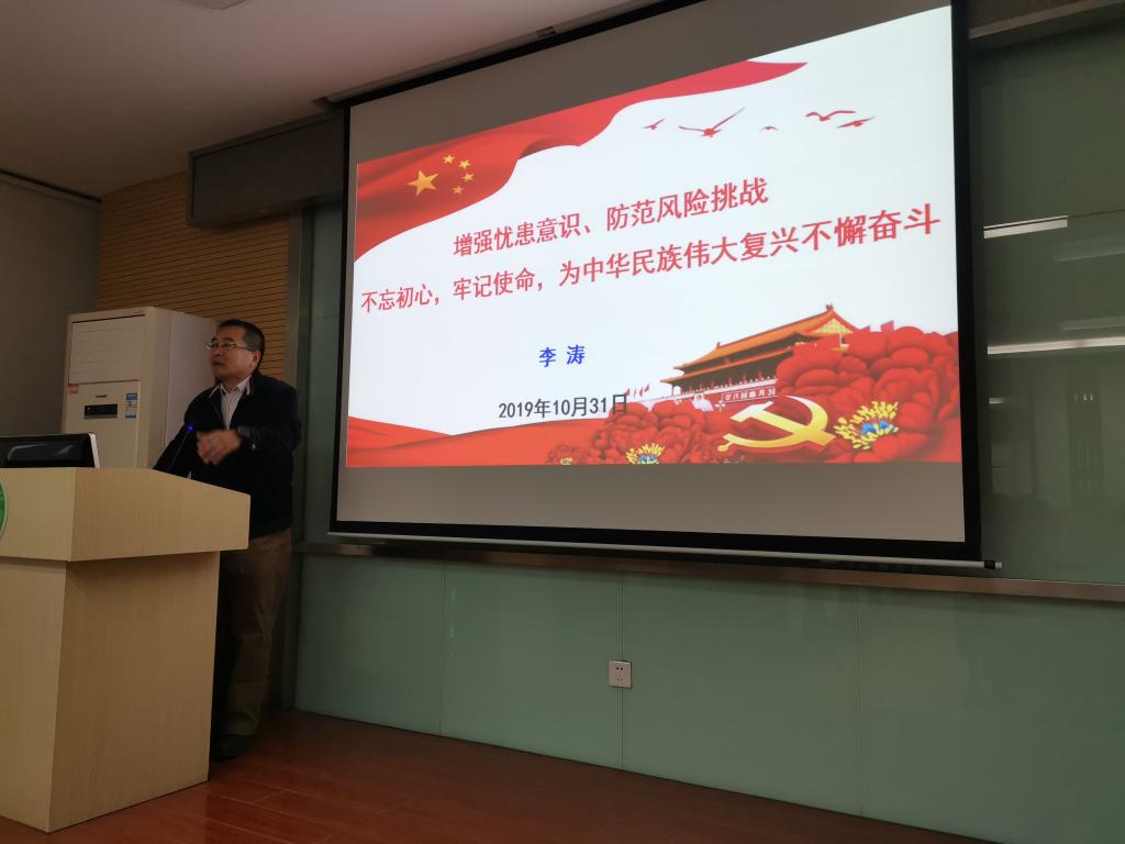 (通讯员:崔露、刘赵昊旻)10月31日晚7:00,公司党委书记李涛教授以“增强忧患意识,防范风险挑战,为中华民族伟大复兴不懈奋斗”为主题,面向公司教师、员工党支部全体委员讲授党课。伟德国际VICTOR1946学工处副处长刘雅然、原软件公司党委书记陈业美、公司党委副书记吴疆鄂、副经理刘宏芳、龚跃法与公司党支部全体委员共同聆听党课。在“不忘初心、牢记使命”主题教育的深入推进下,李涛书记指出,新时代党员干部应当“增强忧患意识,防范风险挑战,为中华民族伟大复兴不懈奋斗”。